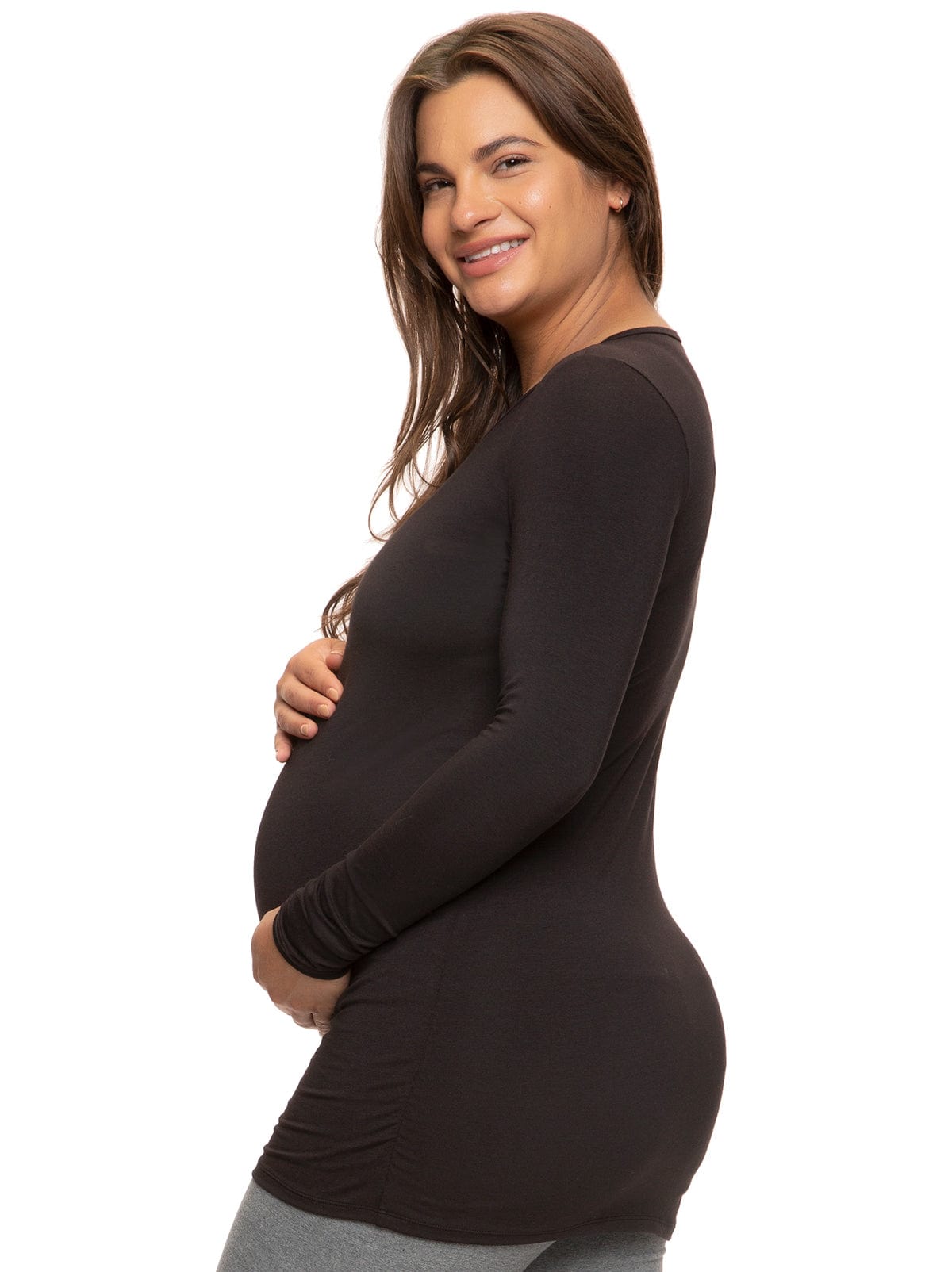 This super comfy long sleeve maternity shirt has the perfect amount of stretch and breathability! This maternity top for women is designed to keep expecting moms comfortable all day long.