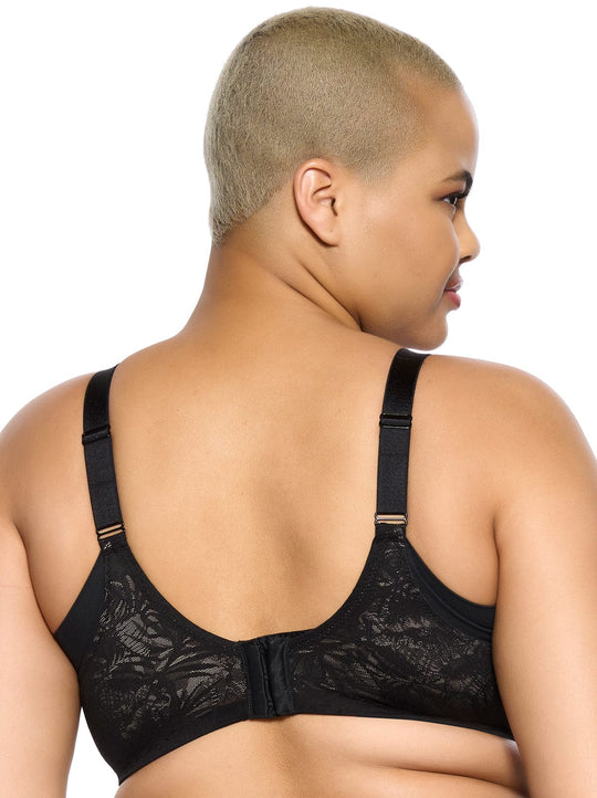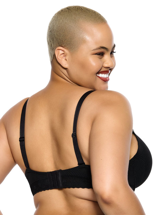 Victoria - A woman wearing a black unlined lace bra with a U-shaped back and flat seams.