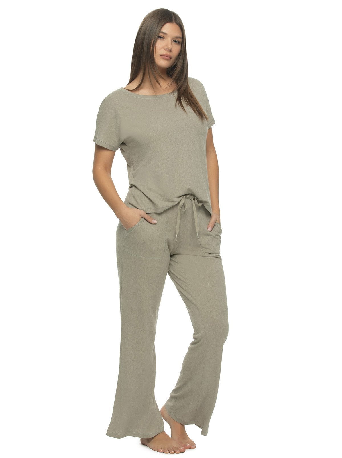 Effortlessly transition from bed to brunch with the relaxed yet elevated Lauren Lounge Pant Set. Crafted in a soft, breathable linen-blend knit, the wide-leg flare pants feature a drawstring waistband and deep cargo pockets for comfort and functionality. Paired with a classic crew neck tee, this set is the ideal go-to for mornings in, errands out, and everything in between.