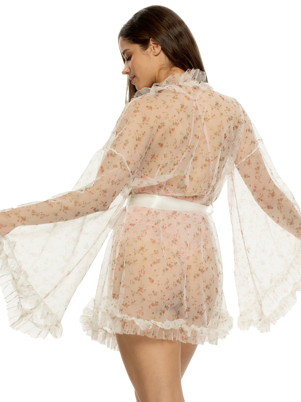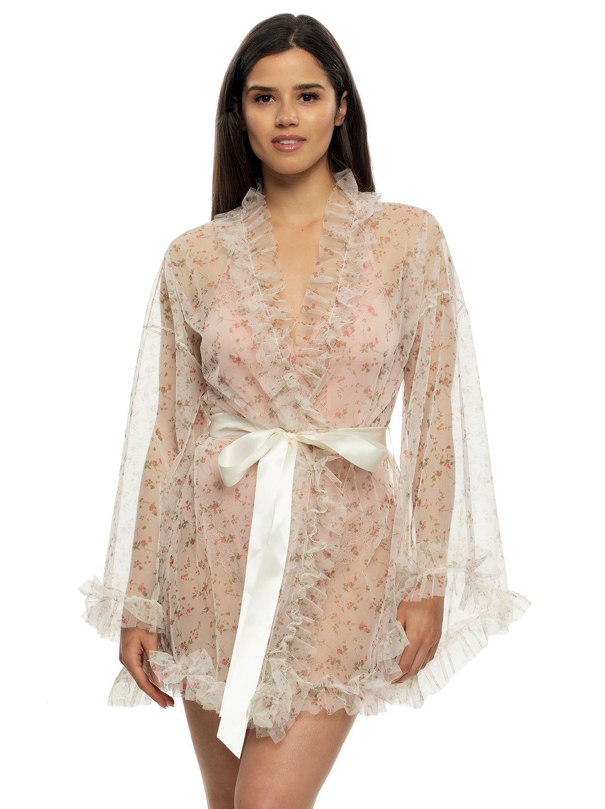 This classic Old Hollywood mini robe has a voluminous sleeve, playful tulle body, with ruffle trim at hem and along neckline. A wide satin sash wraps all the way around, held in place with narrow satin ribbon loops at side-seams. This Veil Luxe Rob is an elegant, dramatic, versatile, and sexy addition to any lingerie assortment.