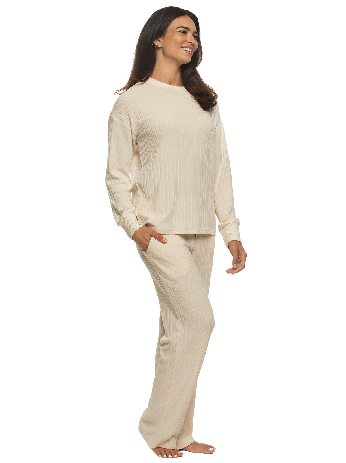 Enjoy ultimate comfort and effortless style with our Crew Neck & Pant Set. Ideal for relaxing at home or casual outings, this set features a flattering long sleeve top that’s easy to layer in cooler weather or wear on its own as temperatures rise. Wide leg drawstring pants keep you comfortable for cozy nights at home or on the go. Made from ultra-soft ribbed fabric, it offers a gentle, luxurious feel you'll appreciate all day long.