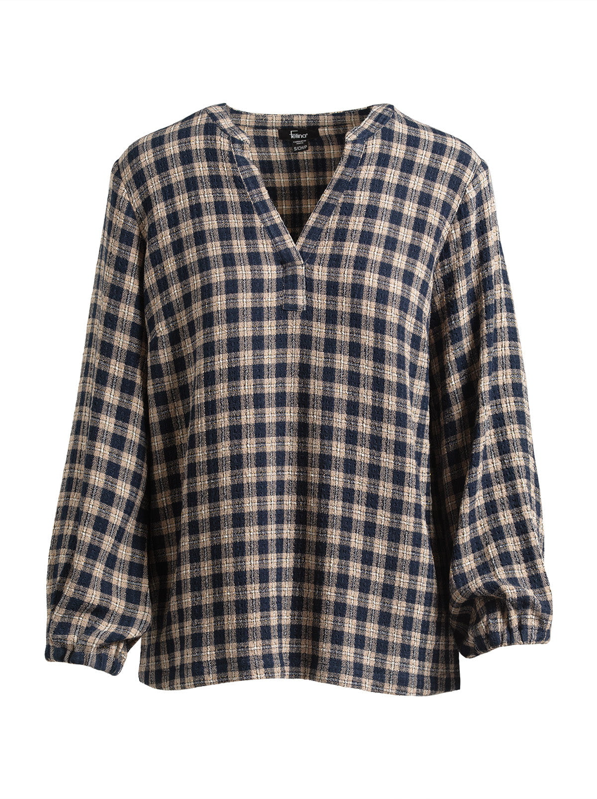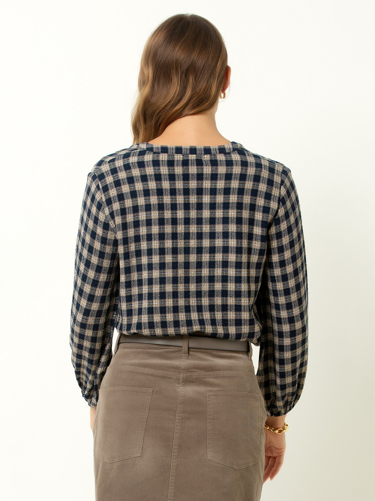 This V-Neck Plaid Peasant Top features a subtle shimmer with delicate lurex threading woven into the plaid fabric. Its flattering V-neckline and softly gathered puffy sleeves create an elegant silhouette. With a relaxed fit and lightweight drape, it easily pairs with both casual and dressy outfits.