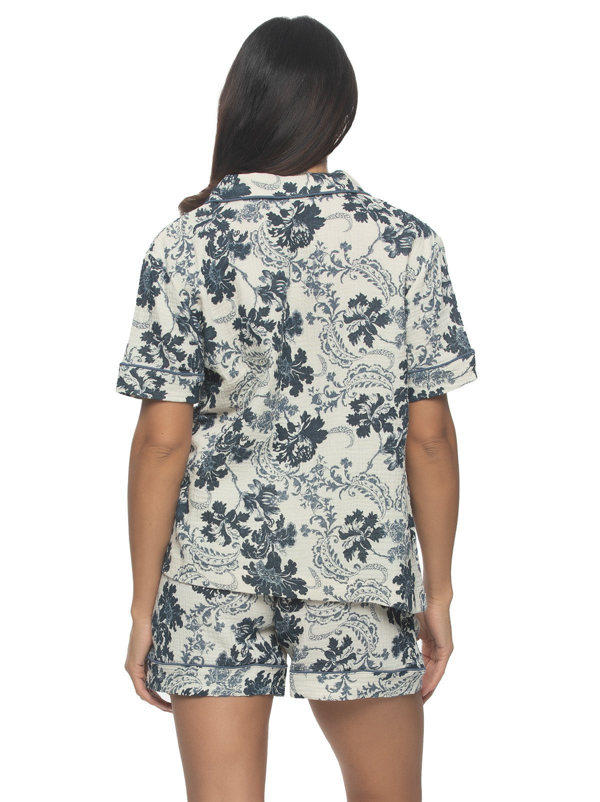 A feminine breezy silhouette - the Calista lightweight pajama set is made of 100% Cotton for maximum cooling and comfort. The set includes drawstring shorts with with side pockets and a notch collar button down short sleeve shirt. Available in two floral prints this new effortless PJ set offers the perfect transition pieces from spring to summer to wear together or as separates.